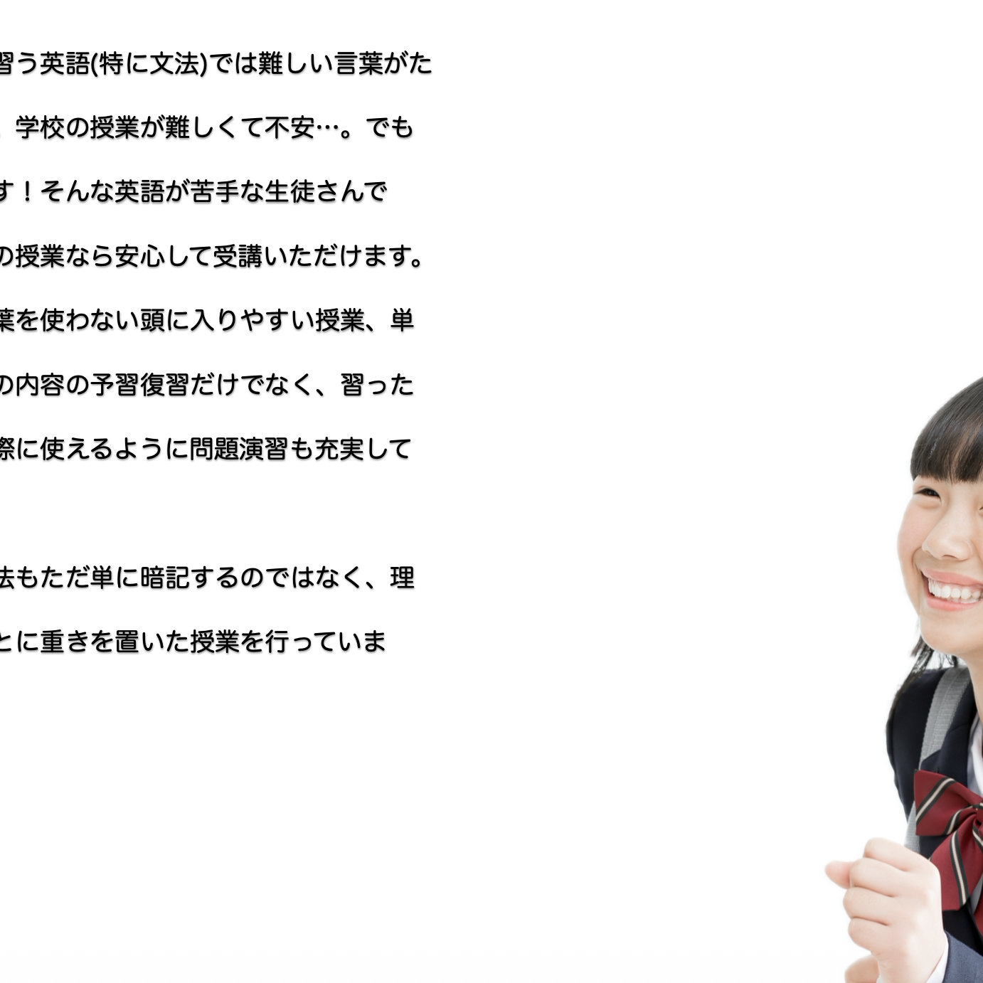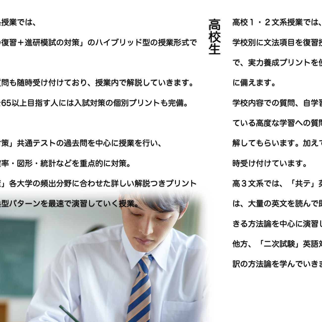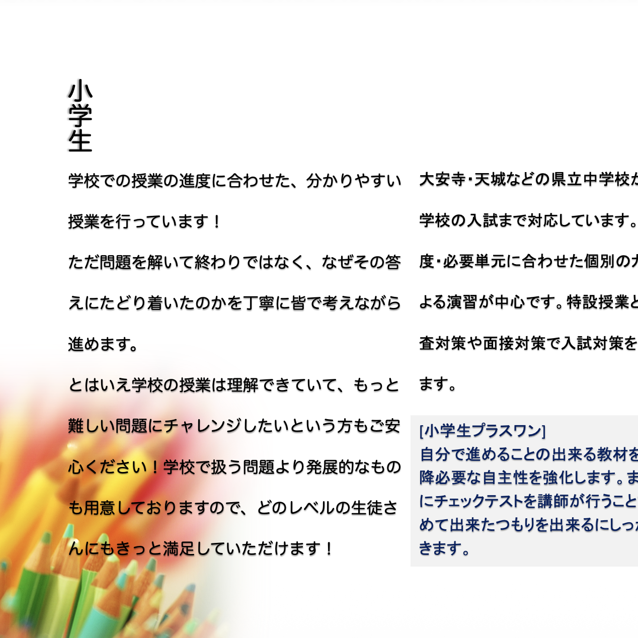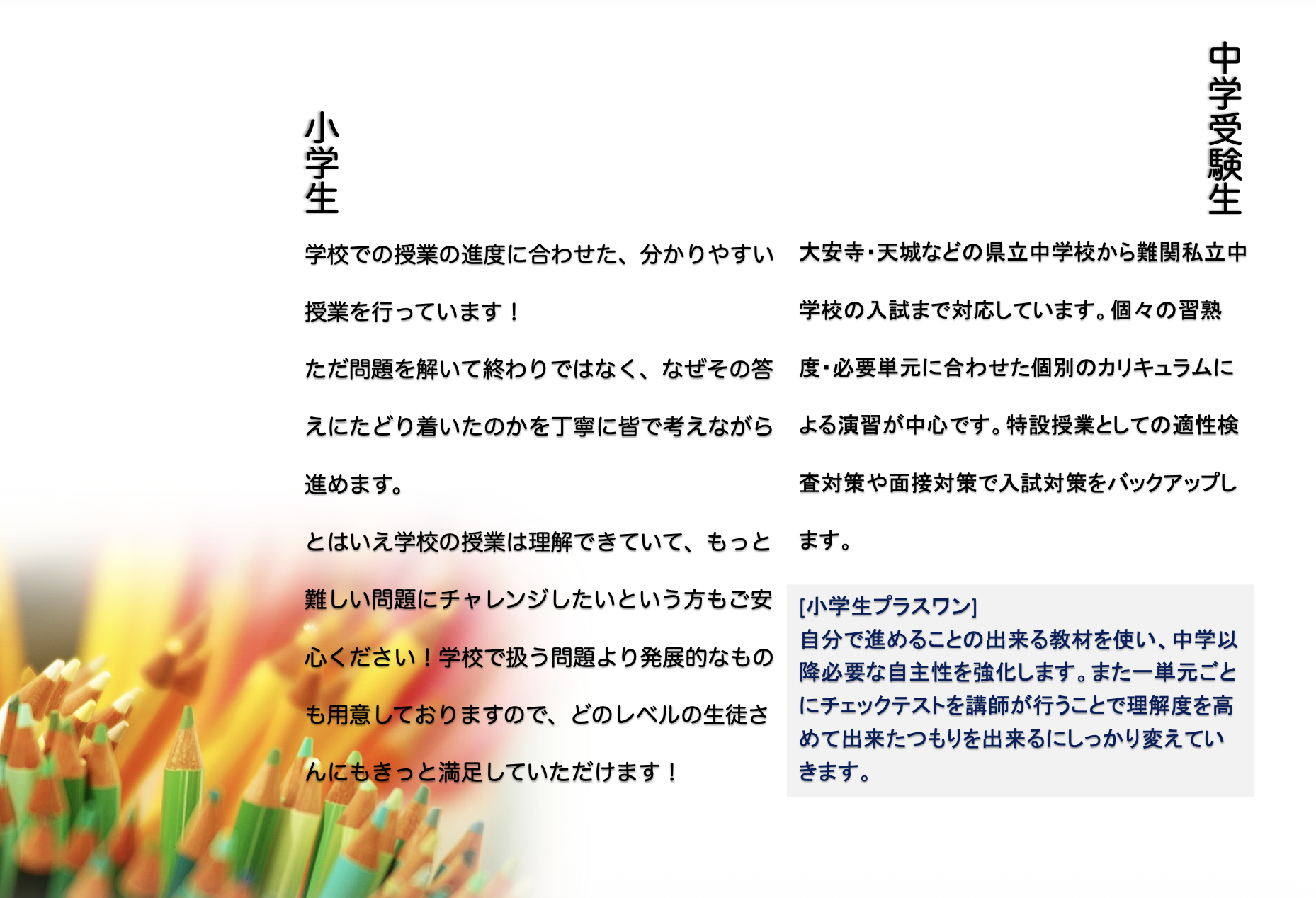 講師が決め手!ベテランの講師がわかりやすく指導します。 集団指導 授業内容のご紹介 集団指導での授業内容をご紹介します。(各コースをクリックすると拡大されます) ● 小学生コース ● 中学生コース ● 高校生コース お問い合わせ