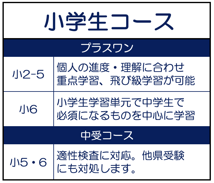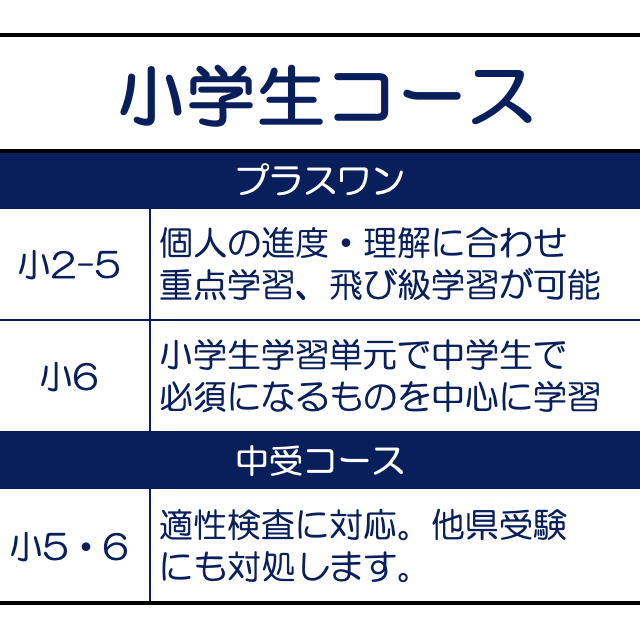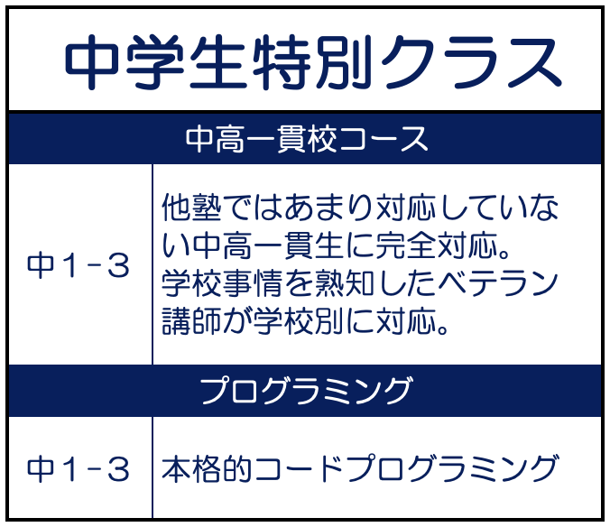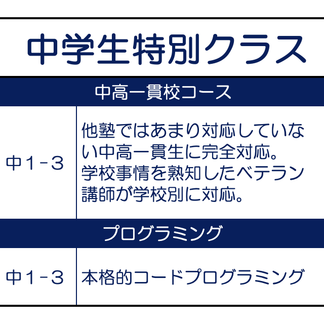 小中高の学校の日常学習から、中学受験、高校受験、大学受験まで幅広く対応します。また、中高一貫校へ通う方用に特別のクラスが設置されています。