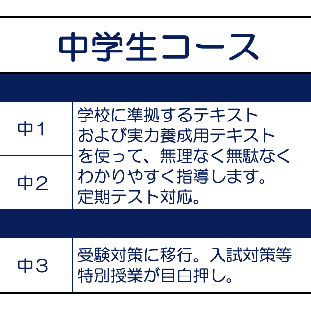 中1・2では学校準拠のテキストを使って学校の勉強を完全マスター。もちろん実力をつけるための錬成も。中3では5教科対応(私立高校第一志望の場合には3教科選択可)。入試対策、特別入学者選抜対策、直前対策、私立高校対策と対策授業が目白押しです。