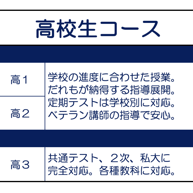 高1・2では学校に進度に合わせて学校の勉強を完全マスター。もちろん実力をつけるための錬成も。高3では共通テスト対策、2次対策、私大対策、総合型対策(推薦対策、小論文対策含む)と、進度に合わせた選択が可能です。
