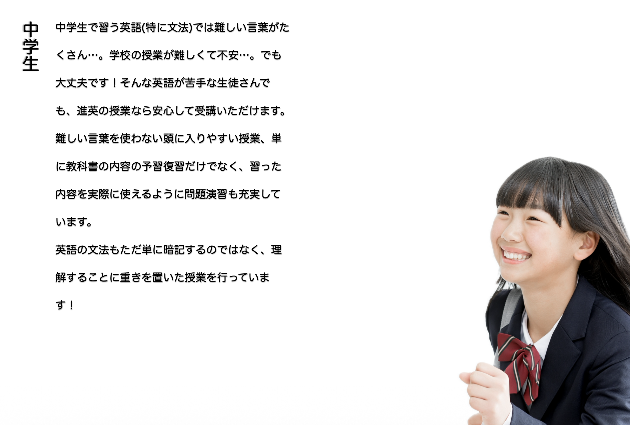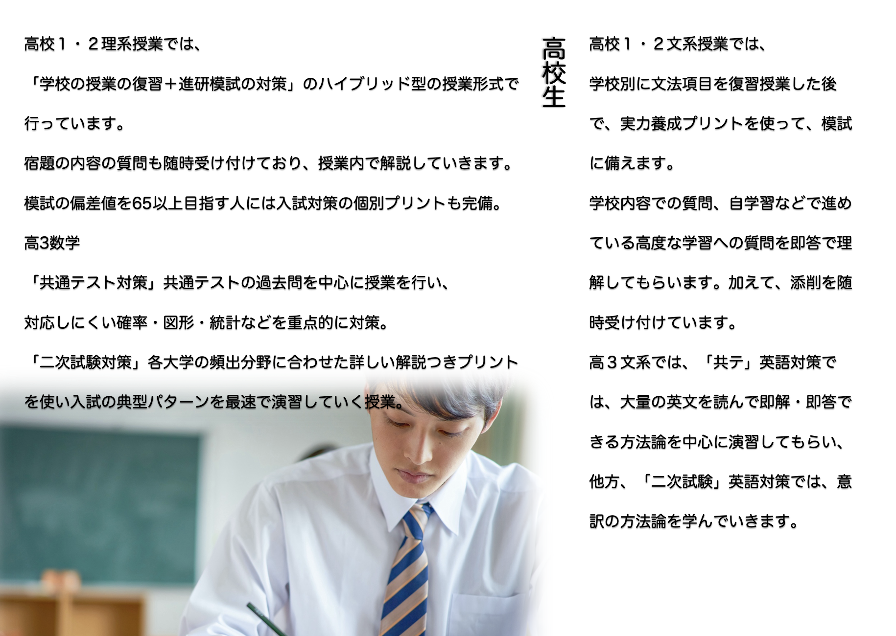 講師が決め手!ベテランの講師がわかりやすく指導します。 集団指導 授業内容のご紹介 集団指導での授業内容をご紹介します。(各コースをクリックすると拡大されます) ● 小学生コース ● 中学生コース ● 高校生コース お問い合わせ